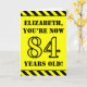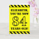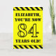 The front of this bold and attention-grabbing birthday themed greeting card design features a personalised name and the message "YOU’RE NOW 84 YEARS OLD!" in black stencil look text on a yellow coloured background. There is also an eye-catching yellow and black striped pattern at the top and bottom edges of the front. The inside features a customised birthday greeting message, or could perhaps be cleared and left blank if a message is to be written by hand instead. A birthday card like this might be a fun way to send birthday wishes to somebody who is celebrating their eighty fourth birthday. [~Z0000413]