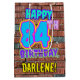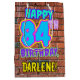The front of this fun birthday-themed gift bag design features the message “HAPPY 84TH BIRTHDAY,” having a colourful, vibrant, graffiti and urban street art inspired appearance, in addition to a custom recipient name. The background features a pattern inspired by the look of a brick wall. A vibrant gift bag like this might be used when wrapping presents being given to somebody in celebration of their eighty fourth birthday. [~Z0000536]