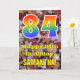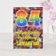 The front of this colourful, rustic, and autumn-themed birthday greeting card design features a large number "84" with a rainbow spectrum gradient inspired pattern, along with the message "Happy 84th Birthday,", and an editable name. The front features a background depicting rustic fallen autumn leaves. The inside features a customised birthday greeting message, or could perhaps be cleared and left blank if a message is to be written by hand instead. A personalised birthday card like this might be a fun way to send a message in celebration of somebody’s eighty fourth birthday. [~Z0000384]