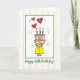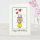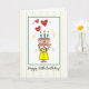 This light card of a woman holding up her 85th birthday cake, is reaching towards 3 hearts, for the past, present, and future.