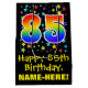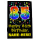 This exciting, vibrant, and colourful birthday themed giftbag design features a large number "85" with a rainbow spectrum gradient inspired pattern, along with the message "Happy 85th Birthday,", and a customisable recipient name. It also has a colourful background pattern featuring variously-sized star shapes. A birthday themed gift-bag like this might be a fun way to wrap a gift or present being given to somebody who is celebrating their eighty fifth birthday. [~Z0000510]