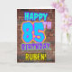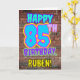 The front of this fun birthday-themed greeting card design features the message “HAPPY 85TH BIRTHDAY,” having a colourful, vibrant, urban street art and graffiti inspired appearance, in addition to a custom recipient name. The background of the front features a pattern inspired by the look of a brick wall. The inside has a personalised birthday greeting message, or could perhaps be cleared and left blank if a message is to be written by hand instead. A fun, customisable birthday greeting card like this might be used to celebrate somebody’s eighty-fifth birthday. [~Z0000531]
