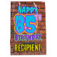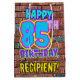 The front of this fun birthday themed gift bag design features the message “HAPPY 85TH BIRTHDAY,” having a vibrant, colourful, graffiti-inspired look, in addition to a personalised recipient name. The background features a brick wall inspired pattern. A vibrant gift bag like this might be used when giving a gift or present in honour of somebody’s 85th birthday. [~Z0000536]