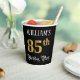 This fancy and luxurious birthday paper cup design features an editable name and the message “85th Birthday Party”. The large number “85th” has a faux/imitation gold-inspired colouring pattern, and the words “Birthday Party” are in ornate script-style text. The background is coloured black by default (although it can be customised). Elegant, ornate paper cups like this might be used at a birthday celebration being held in celebration of somebody’s 85th birthday. [~Z0000567]