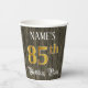 This elegant and luxurious birthday themed paper cup design features a custom name and the message “85th Birthday Party”. The large number “85th” features an imitation/faux gold-inspired colouring pattern, the words “Birthday Party” are in ornate script-style text, and the background features an imitation/faux woodgrain-inspired appearance. Fancy, opulent paper cups like this might be useful at a birthday celebration/party being held to honour somebody’s 85th birthday. [~Z0000568]