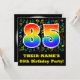 The front of this fun, colourful, and exciting birthday party invitation design features a large number "85" having a rainbow spectrum gradient inspired pattern. It also features an editable name and the message "85th Birthday Party!". Part of the background has a fun and colourful music notes and symbols pattern. The back features editable information/details pertaining to the event that the potential guests are being invited to. Joyful, editable birthday party invitation cards like this might be used when inviting guests to attend a gathering being held to celebrate a song composer’s, a musician’s, a singer’s, or somebody else’s 85th birthday. [~Z0000427]