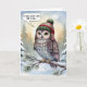 A charming owl in a winter hat perches on a snow-covered branch in a peaceful snowy forest, depicted in watercolor, for anyone's 85th birthday.