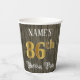This opulent and luxurious birthday-themed paper cup design features a personalised name and the message “86th Birthday Party”. The large number “86th” has an imitation/faux gold-inspired colouring pattern, the words “Birthday Party” are in fancy script-style text, and the background features an imitation/faux woodgrain-inspired pattern. Ornate, elegant paper cups like this might be useful at a birthday celebration/party being held to celebrate somebody’s 86th birthday. [~Z0000568]