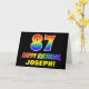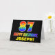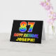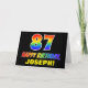 The front of this colourful, fun, and cheerful birthday greeting card design features a large number "87" and the message "HAPPY BIRTHDAY,", both coloured with a rainbow spectrum gradient inspired pattern, along with a bold yellow custom recipient name. The front also features a minimal, simple, black coloured background. The inside has a customisable birthday greeting message, or could perhaps be cleared and left blank if a message is to be written by hand instead. A colourful personalised birthday card like this might be a fun way to celebrate somebody’s eighty seventh birthday. [~Z0000472]