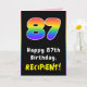 This bold and joyful birthday greeting card design features a big number “87“ with a multicolor rainbow spectrum inspired gradient pattern, along with the message “Happy 87th Birthday,”, and a personalised recipient name. The inside features an editable birthday greeting message, or could perhaps be cleared and left blank if a message is to be written by hand instead. An upbeat, personalised birthday greeting card like this might be sent in celebration of somebody’s eighty-seventh birthday. [~Z0000627]