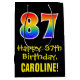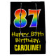 This exciting, colourful, and fun birthday-themed giftbag design features a large number "87" with a rainbow spectrum gradient style pattern, along with the message "Happy 87th Birthday,", and a custom recipient name. The background is coloured black. A gift bag like this might be used when giving a gift or present in honour of somebody’s 87th birthday. [~Z0000512]