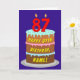 This cheerful and joyful birthday-themed greeting card design features a depiction of a three-tier birthday cake having number-shaped candles on top showing the age “87“, along with the message “HAPPY 87TH BIRTHDAY,”, and an editable recipient name. The inside features a customised birthday greeting message, or could perhaps be cleared and left blank if a message is to be written by hand instead. A fun, customisable birthday greeting card like this might be sent in celebration of somebody’s eighty-seventh birthday. [~Z0000620]