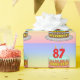 This joyful and upbeat birthday wrapping paper design features a cartoon-style depiction of a three-tier birthday cake having numeral-shaped candles on top showing the number “87“, along with the message “HAPPY 87TH BIRTHDAY,”, and an editable recipient name. The background features a multi-colour pastel rainbow spectrum inspired gradient pattern. Birthday themed wrapping paper like this might be used when giving a gift or present in celebration of somebody’s 87th birthday. [~Z0000622]