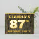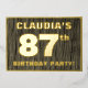 The front of this bold eighty-seventh birthday celebration foil invitation card features an editable name, a large number “87th”, the message “BIRTHDAY PARTY!”, and a border, all in foil. The background of the front features a rustic, yet elegant, faux wood grain look inspired pattern. The back features personalised details about the event, such as the date, time, location/venue, and any other useful information. Customised invitations like these might be used to invite guests/attendees to a birthday gathering/party being held to celebrate somebody’s 87th birthday. [~Z0000598]