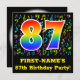 The front of this fun, exciting, and colourful birthday party invitation design features a large number "87" with a rainbow spectrum gradient inspired pattern, along with a customisable name and the message "87th Birthday Party!". Part of the background has a fun pattern of various music notes and symbols having a variety of colours and sizes. The back features customised information about the event that the potential guests are being invited to. Happy, customised birthday party invitation cards like this might be sent to potential guests of a celebration being held to celebrate a musician’s, a singer’s, a song composer’s, or somebody else’s 87th birthday. [~Z0000427]
