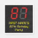 This fun and nerdy birthday paper napkin design features a large number "87" with a red seven segment digital display style appearance, along with a custom name and the message "87th Birthday Party!" in geeky yellow text, on a black coloured background. Fun, customisable paper napkins like this might be used at a birthday celebration being held in honour of somebody’s eighty seventh birthday. [~Z0000388]