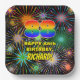 This eye-catching and fun birthday-themed paper plate design features a large number “88” having a colourful rainbow spectrum inspired gradient pattern. It also features the message “HAPPY 88th BIRTHDAY,”, and a custom name. The background of the front features a vibrant, multicolored, bursting celebratory fireworks-inspired pattern. Bold paper plates like this might be fun to use at a party in honour of somebody’s eighty eighth birthday. [~Z0000604]