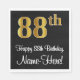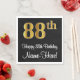 This elegant, sophisticated, and luxurious birthday themed paper napkin design features a large ordinal number “88th” having a faux/imitation gold-like look, plus the birthday greeting message “Happy 88th Birthday,” and a customisable name in a script-style font. The background is coloured black. Paper napkins like this might be used at a party for somebody who is celebrating their eighty eighth birthday. [~Z0000516]