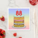 This upbeat and cheerful birthday-themed paper napkin design features a cartoon-style depiction of a three-tier birthday cake having number-shaped candles on top showing the age “88“, along with the message “HAPPY 88TH BIRTHDAY,”, and a custom recipient name. The background features a multicolored pastel rainbow spectrum inspired gradient pattern. Colourful birthday themed paper napkins like these might be used at a party celebrating somebody’s 88th birthday. [~Z0000623]