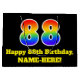 This vibrant and colourful birthday-themed giftbag design features a large number "88" with a rainbow spectrum gradient inspired pattern, along with the message "Happy 88th Birthday,", and a customisable name. It also has a black-coloured background. A gift-bag like this might be used when giving a gift or present in honour of somebody’s eighty eighth birthday. [~Z0000521]