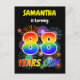 The front of this fun and lively birthday party invitation postcard design has an editable name, an exciting bursting celebratory fireworks inspired pattern, and the message "88 YEARS OLD!" having a colourful rainbow spectrum inspired gradient pattern. The back features a personalised message with information about the party, such as when and where it is being held. Invitation postcards like this might be sent to potential attendees of a birthday party being held in celebration of somebody’s eighty eighth birthday. [~Z0000452]