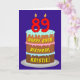 The front of this fun and joyful birthday greeting card design features a depiction of a three-tier birthday cake having number-shaped candles on top showing the age “89“, along with the message “HAPPY 89TH BIRTHDAY,”, and a custom recipient name. The inside has an editable birthday greeting message, or could perhaps be cleared and left blank if a message is to be written by hand instead. A cheerful, customisable birthday greeting card like this might be a fun way to send a birthday greeting message to somebody who is celebrating their eighty-ninth birthday. [~Z0000620]