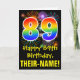 The front of this exciting, fun, and colorful birthday-themed greeting card design features a large number "89" with a rainbow spectrum gradient inspired pattern, along with the message "Happy 89th Birthday,", and a custom recipient name. The front additionally features a colorful background pattern inspired by bursting celebratory fireworks. The inside features a personalized birthday greeting message, or could perhaps be cleared and left blank if a message is to be written by hand instead. A customizable birthday card like this might be a fun way to send a message in celebration of somebody’s eighty ninth birthday. [~Z0000442]