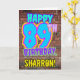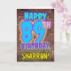 The front of this fun birthday greeting card design features the message “HAPPY 89TH BIRTHDAY,” having a vibrant, colourful, graffiti-inspired look, along with an editable recipient name. The background of the front features a brick wall inspired pattern. The inside has an editable birthday greeting message, or could perhaps be cleared and left blank if a message is to be written by hand instead. A fun, customised birthday greeting card like this might be used to acknowledge somebody’s eighty-ninth birthday. [~Z0000531]
