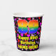 This cheerful and fun birthday paper cup design features a large number “89” with a rainbow spectrum gradient inspired pattern, along with the message “Happy 89th Birthday,”, and a personalised name. The background features a pattern of heart shapes with colours like pink, purple, and red. Loving, fun paper cups like this might be fun to have at a birthday celebration being held in celebration of somebody’s eighty ninth birthday. [~Z0000548]
