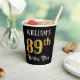 This elegant and luxurious birthday paper cup design features a custom name and the message “89th Birthday Party”. The large number “89th” has an imitation/faux gold-inspired colouring pattern, the words “Birthday Party” are in fancy script-style text, and the background is coloured black by default (although it can be customised). Opulent, fancy paper cups like this might be useful at a birthday celebration/party being held in celebration of somebody’s eighty ninth birthday. [~Z0000567]