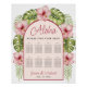 A tropical floral chart, appropriate for a Hawaiian wedding / luau. The text is inside a pink arch with burgundy red borders. Around the arch, there are tropical flowers and leaves - monstera and palm leaves and pink hibiscus - painted in watercolor. The title "Aloha" and the names are written in handwriting script, in a burgundy red similar in colour with the centre of the hibiscus flowers, the rest of the text is black (all caps).