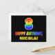 The front of this cheerful, colourful, and fun birthday-themed postcard design features a large number "8" and the message "HAPPY BIRTHDAY,", both coloured with a rainbow spectrum gradient inspired pattern, along with a bold yellow customisable recipient name. The front also features a simple, minimal, black coloured background. The back of the postcard has a custom birthday greeting message, or could perhaps be cleared and left blank if a message is to be written by hand instead. A cheerful customisable birthday postcard like this might be a fun way of celebrating somebody’s eighth birthday. [~Z0000474]