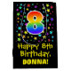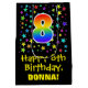 This exciting, colourful, and vibrant birthday-themed giftbag design features a large number "8" with a rainbow spectrum gradient inspired pattern, along with the message "Happy 8th Birthday,", and a personalised recipient name. It also has a background pattern featuring star shapes of various sizes and colours. A gift-bag like this might be used when wrapping gifts being given to somebody in celebration of their eighth birthday. [~Z0000510]