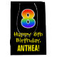 This exciting, colourful, and fun birthday gift bag design features a large number "8" with a rainbow spectrum gradient inspired pattern, along with the message "Happy 8th Birthday,", and a custom recipient name. The background is coloured black. A gift bag like this might be a fun way of wrapping a birthday present or gift being given to somebody who is celebrating their eighth birthday. [~Z0000512]