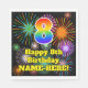 This joyful and fun birthday themed paper napkin design features a large number “8” having a colourful rainbow spectrum gradient inspired pattern. It also features the message “Happy 8th Birthday,”, and a personalised name. The background features an exciting and colourful pattern inspired by the appearance of bursting celebratory fireworks. Vibrant paper napkins like this might be fun to use at a party held in honour of somebody’s eighth birthday. [~Z0000574]