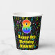 This exciting and colourful music-themed birthday paper cup design features a large number “8” with a rainbow spectrum gradient inspired pattern, along with the message “Happy 8th Birthday,”, and a custom name. The background features a colourful pattern of various music notes and symbols having a variety of colours and sizes. Vibrant, colourful paper cups like this might be fun to have at a birthday celebration/party being held to honour somebody’s eighth birthday. [~Z0000541]