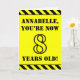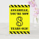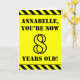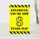 The front of this bold and attention-grabbing birthday themed greeting card design features a customisable name and the message "YOU’RE NOW 8 YEARS OLD!" in black stencil look text on a yellow coloured background. The front also features an eye-catching yellow and black striped pattern at the top and bottom edges. The inside features a customised birthday greeting message, or could perhaps be cleared and left blank if a message is to be written by hand instead. A personalised birthday card like this might be a fun way to acknowledge somebody’s eighth birthday. [~Z0000413]