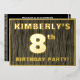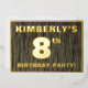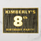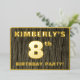 The front of this bold eighth birthday party foil invitation card features a personalized name, a large number “8th”, the message “BIRTHDAY PARTY!”, and a border, all in foil. There is a rustic, yet sophisticated, faux wood grain look inspired pattern for the background of the front. The back features personalized details about the event, such as the date, time, venue/location, and any other useful information. Customizable invitations like these might be used to invite attendees/guests to a birthday party being held in celebration of somebody’s 8th birthday. [~Z0000598]