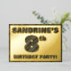 The front of this bold eighth birthday party foil invitation card features a personalised name, a large number “8th”, the message “BIRTHDAY PARTY!”, and a border, all featuring a rustic, yet sophisticated, faux wood grain look inspired pattern. The back features personalised details about the event, such as the date, time, location/venue, and any other useful information. Customised invitations like these might be used to invite attendees to a birthday gathering/party being held to celebrate somebody’s 8th birthday. [~Z0000595]