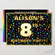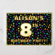 The front of this vibrant eighth birthday party/celebration foil invitation card design features a personalised name, a large number “8th”, the message “BIRTHDAY PARTY!”, and a border. The background of the front features an exciting, colourful pattern of star shapes. The back features personalised details about the event, such as the date, time, place, and any other relevant information. Customised invitations like these might be a fun way to invite attendees to a birthday party/gathering being held in celebration of somebody’s 8th birthday. [~Z0000600]