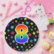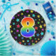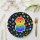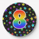 This colourful, fun, and cheerful paper plate design features a large number "8" coloured with a rainbow spectrum gradient inspired pattern. The background features a pattern of colourful star shapes. Paper plates like this might be used at a party celebrating somebody’s 8th birthday, or a couple’s 8th anniversary, or some other 8th event. [~Z0000493]
