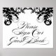 © 2013 Socialite Designs. Elegant corner flourishes in black and silver-grey with 'please sign our guest book' script text poster for framing.