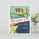 90's Party themed flyer featuring a fun style typography of "90's Party''. Design includes elements of blues, oranges, and pinks, yellow, ripped edges, geometric patterns and shapes inspired by the 90's. Includes a template for personal customisation.