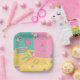 Join us, back in the 90's! Complete your decor at your special 90's birthday party with a 90's theme party plates template. This 90's theme birthday party plate features a rainbow of colours with cassette tape, floppy disc, and a friendship bracelet on a modern style party plates design.