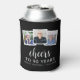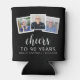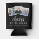 This custom 90th birthday can cooler features a collage of three custom square photos above the phrase "Cheers to 90 years" in elegant white calligraphy script and sans serif font on a black background. Add the guest of honour's name and birthday below. A great way to celebrate someone who's turning ninety!
