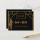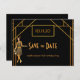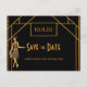 Elegant faux gold and glam for a 90th birthday party! An art deco style birthday party Save the Date card in faux gold and black for a glamourous celebration. Decorated with a 1920's style flapper girl and an art deco style frame. Templates for a date and name/age.