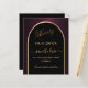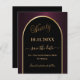 A Save the Date card for a 90th birthday party. A black and burgundy background, decorated with a faux gold arch. Personalise and add a date and your name. The text: Ninety and Save the Date is written with a large trendy hand lettered style script.