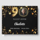 A stylish black background with faux gold stars. Add your photo, name, and text. Age number is written with a balloon style font.