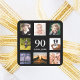 A sticker for a 90th birthday party for a guy, celebrating his life with a collage of 8 of your own photos. Templates for the age 90 and a date. Date of birth or the date of the party. White coloured letters. Black background.