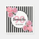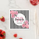 A napkin for a 90th birthday party. Classic slim black and white vertical stripes as background. With girly and feminine pink flowers, roses and peonies as decoration.